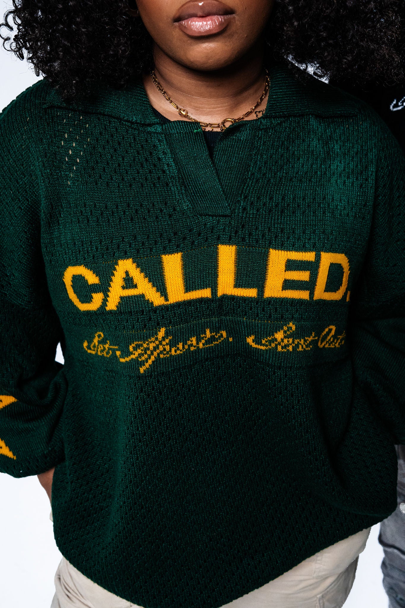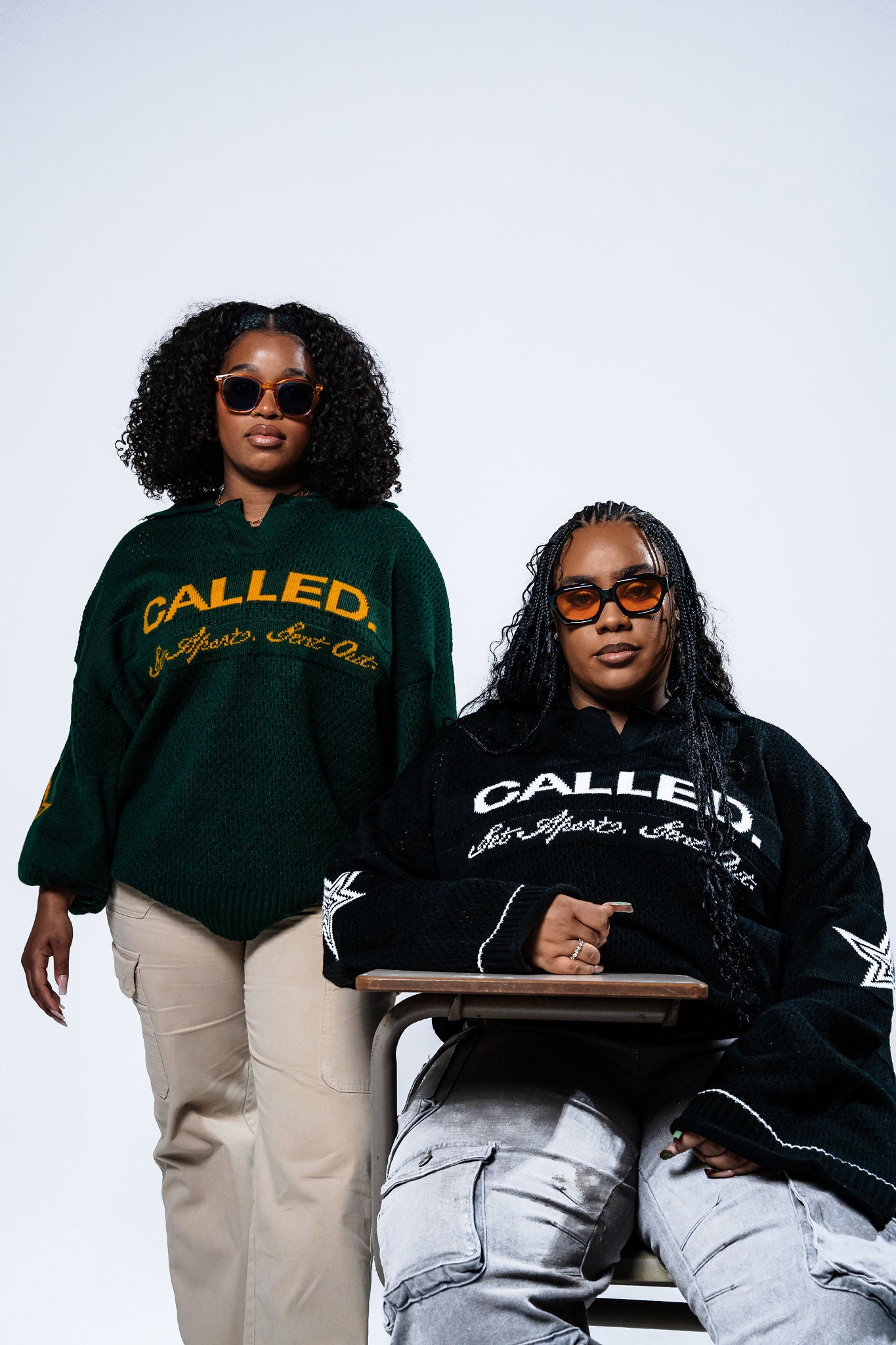 A bold, varsity-inspired “CALLED.” knit hoodie that blends streetwear attitude with everyday comfort. Featuring an oversized, relaxed fit and a cozy heavyweight knit feel, this piece makes a statement with its large collegiate “CALLED.” chest graphic and subtle script detail underneath. Finished with roomy sleeves and contrast sleeve accents for an elevated, premium look. Available in standout colorways like forest green with gold lettering or classic black with white.